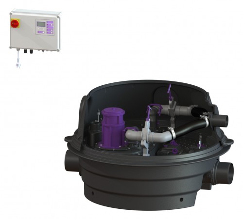 Гибридная подъёмная станция Ecolift XL Duo с двумя насосами, сухая установка, с минимальной глубиной. С электроприводной заслонкой для «серых» сточных вод.