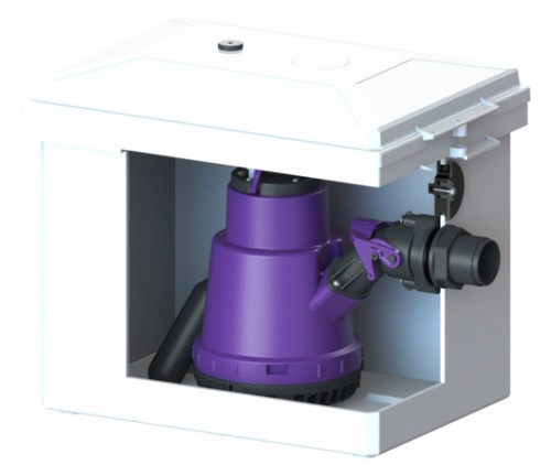 Со съёмным насосом, оснащённым поплавковым выключателем, и заслонкой. Напорное соединение: наружная резьба 1 1/2 дюймов или напорная труба Ø 40 мм ПВХ под клеевое соединение. С угольным фильтром.