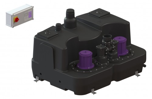 Сдвоенный насос SPF для «чёрных» или «серых» сточных вод, с датчиком контроля давления, многолопастным рабочим колесом (максимальный диаметр включений, свободно проходящих через ячейки: 40 мм). Предназначен для работы в качестве погружного (IP 68), длина кабеля 5 м. Звукопоглощающая подкладка (мат толщиной 10 мм).