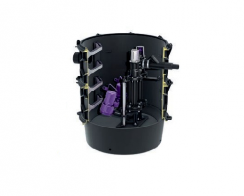 С одинарным или сдвоенным съёмным насосом для «серых» и «чёрных» сточных вод с измельчителем. С гидростатическим датчиком уровня. Напорная труба с наружным диаметром Ø 63/90 мм (в качестве напорной трубы используется сварная полиэтиленовая труба), включая задвижку и запорный клапан со стороны напорной трубы.
