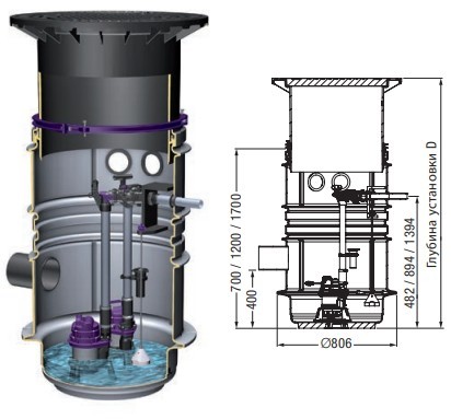 С одинарным или сдвоенным съёмным насосом для «серых» и «чёрных» сточных вод, с измельчителем. Предлагается с поплавковым выключателем или датчиком давления. Наружный диаметр напорной трубы Ø 40 мм (исполнение B/D) или Ø 40/63 мм (исполнение A) ПВХ под клеевое соединение, со встроенной заслонкой одностороннего действия Длина кабеля питания: 10 м (разъём Schuko).