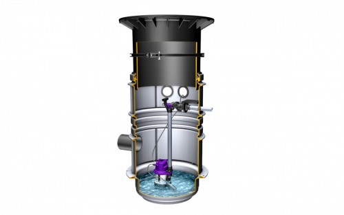 Насосная станция Aqualift F для подземной установки с насосами, оснащёнными измельчителями / режущими механизмами. Одинарная станция с насосом, блоком управления SDS и датчиком давления.