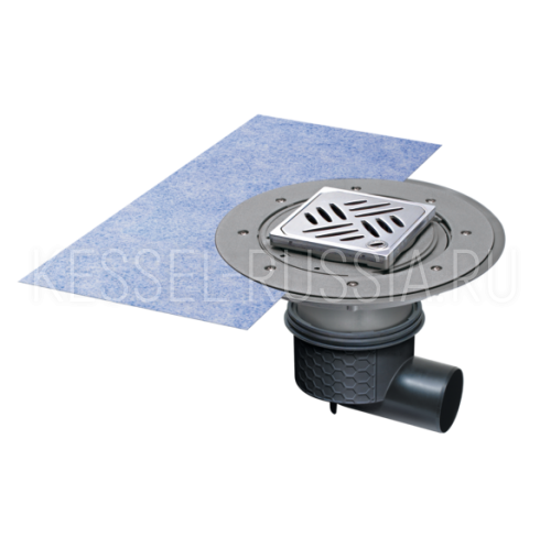 Насадка из АБС с прижимным фланцем и гидроизоляционным полотном, с решеткой с прорезями 138 х 138 мм и рамкой из нержавеющей стали AISI 304, класс L 15 резьбовое соединение.