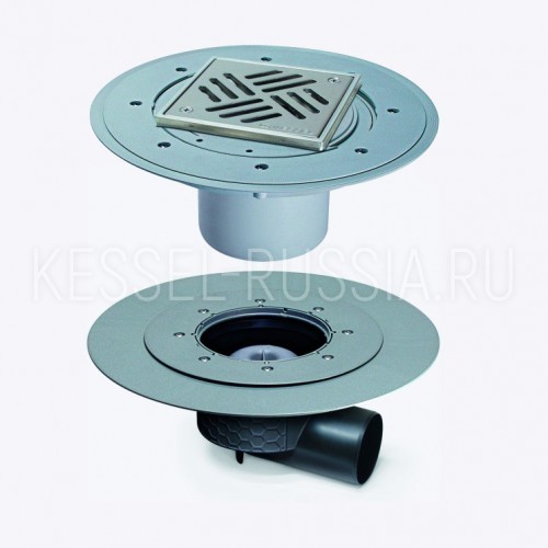 Насадка из АБС с прижимным фланцем и гидроизоляционным полотном с решеткой с прорезями 138 х 138 мм и рамкой из нержавеющей стали AISI 304, класс L 15 резьбовое соединение.