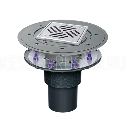 Насадка из АБС с прижимным фланцем и гидроизоляционным полотном. С решеткой с прорезями 138 х 138 мм и рамкой из нержавеющей стали AISI 304, класс L 15 резьбовое соединение.